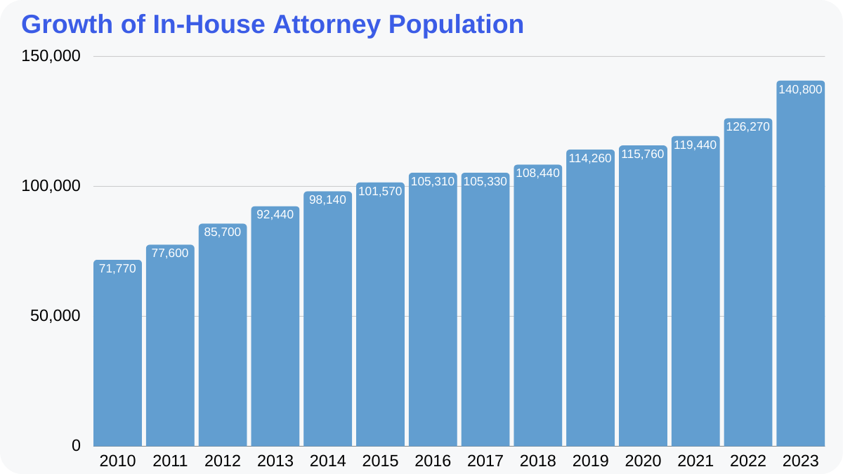 The in-house counsel population has surged from 77,780 in 2008 to 140,800 in 2023, marking an 80% increase and emphasizing the growing importance of internal legal teams in corporations.