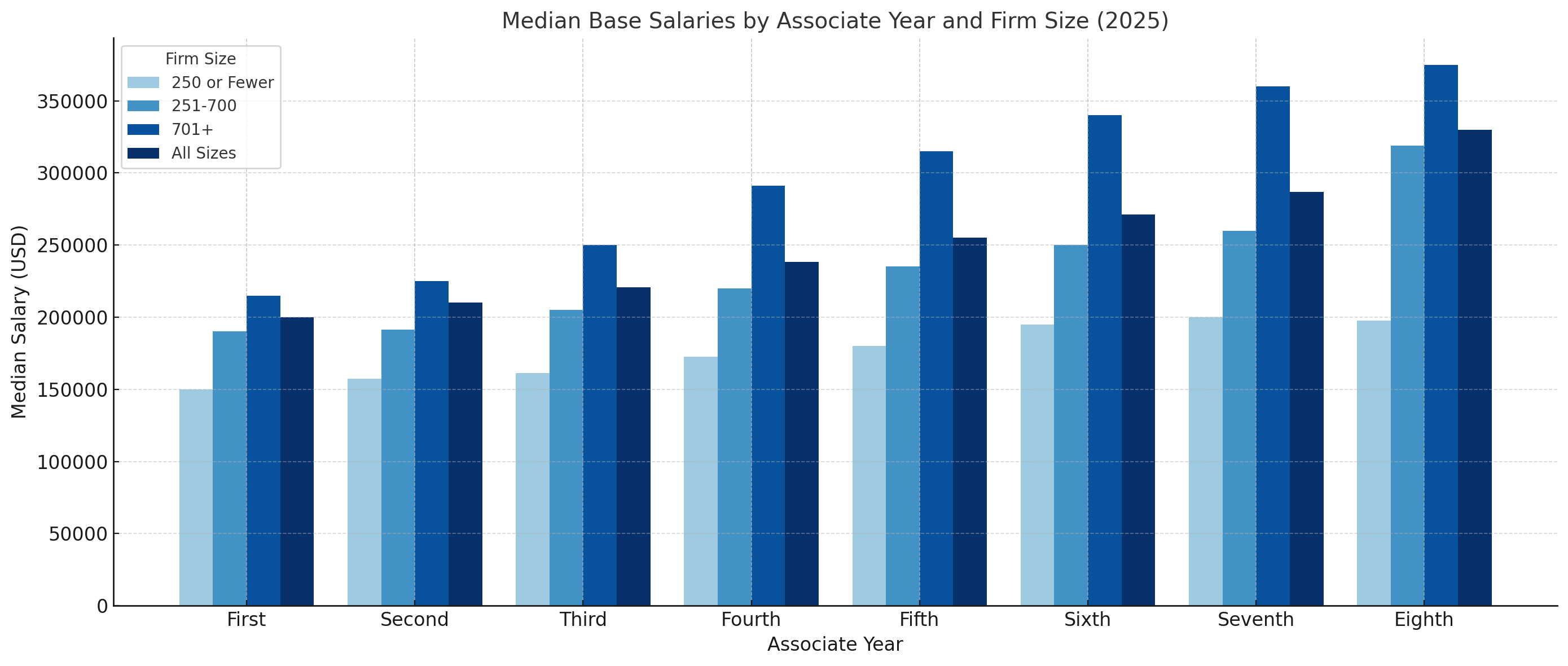 The latest data from the National Association for Law Placement (NALP) indicates a stabilization in first-year associate salaries across U.S. law firms. As of January 1, 2025, the median base salary for entry-level associates remains at $200,000, unchanged since 2023. At firms with more than 700 lawyers, the median salary is slightly higher at $215,000. Despite some firms offering starting salaries of $225,000, these figures have not become standard across the industry.