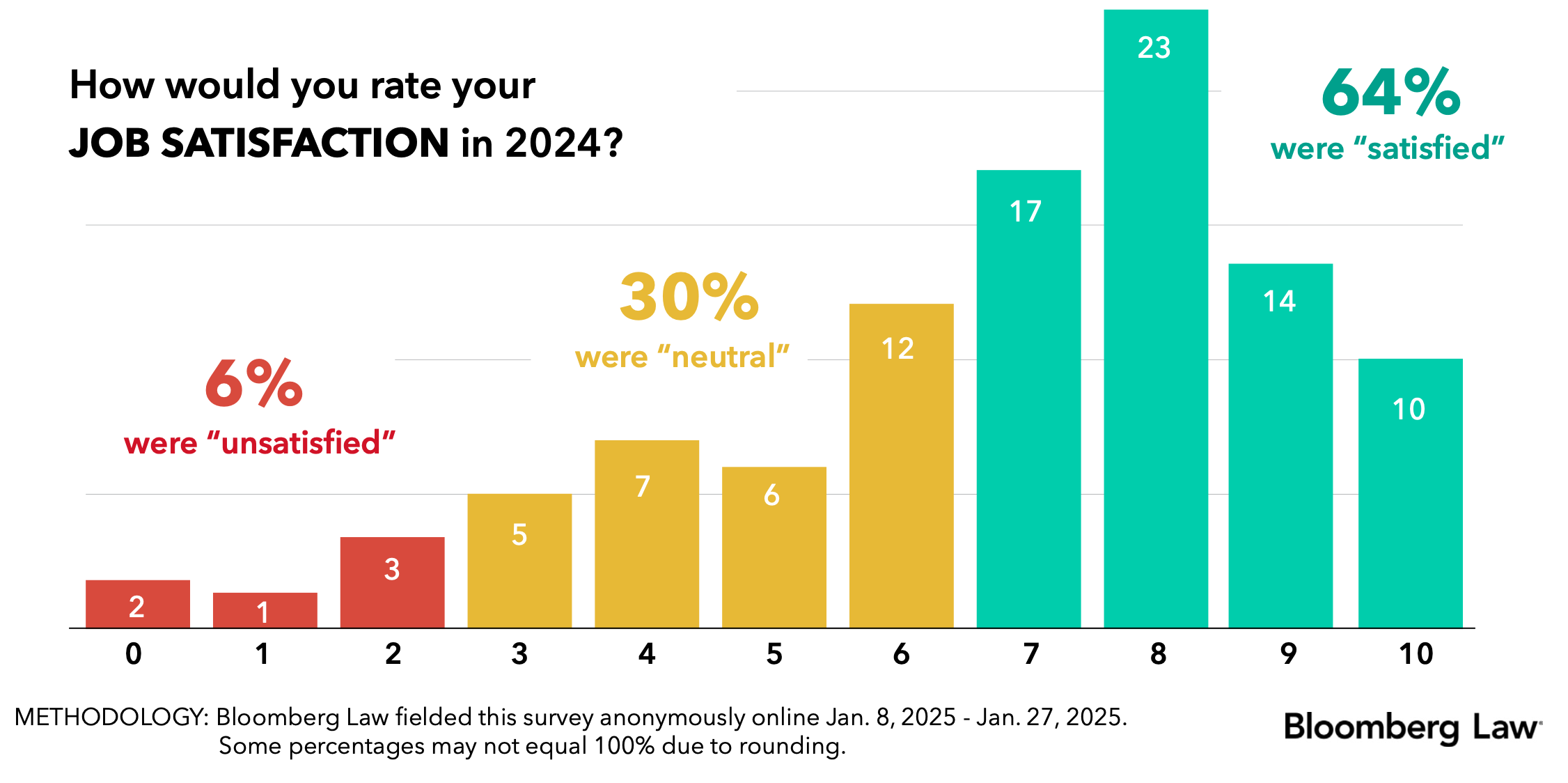 Job satisfaction saw a modest increase, with 64% of attorneys reporting being satisfied in 2024, up from previous years.