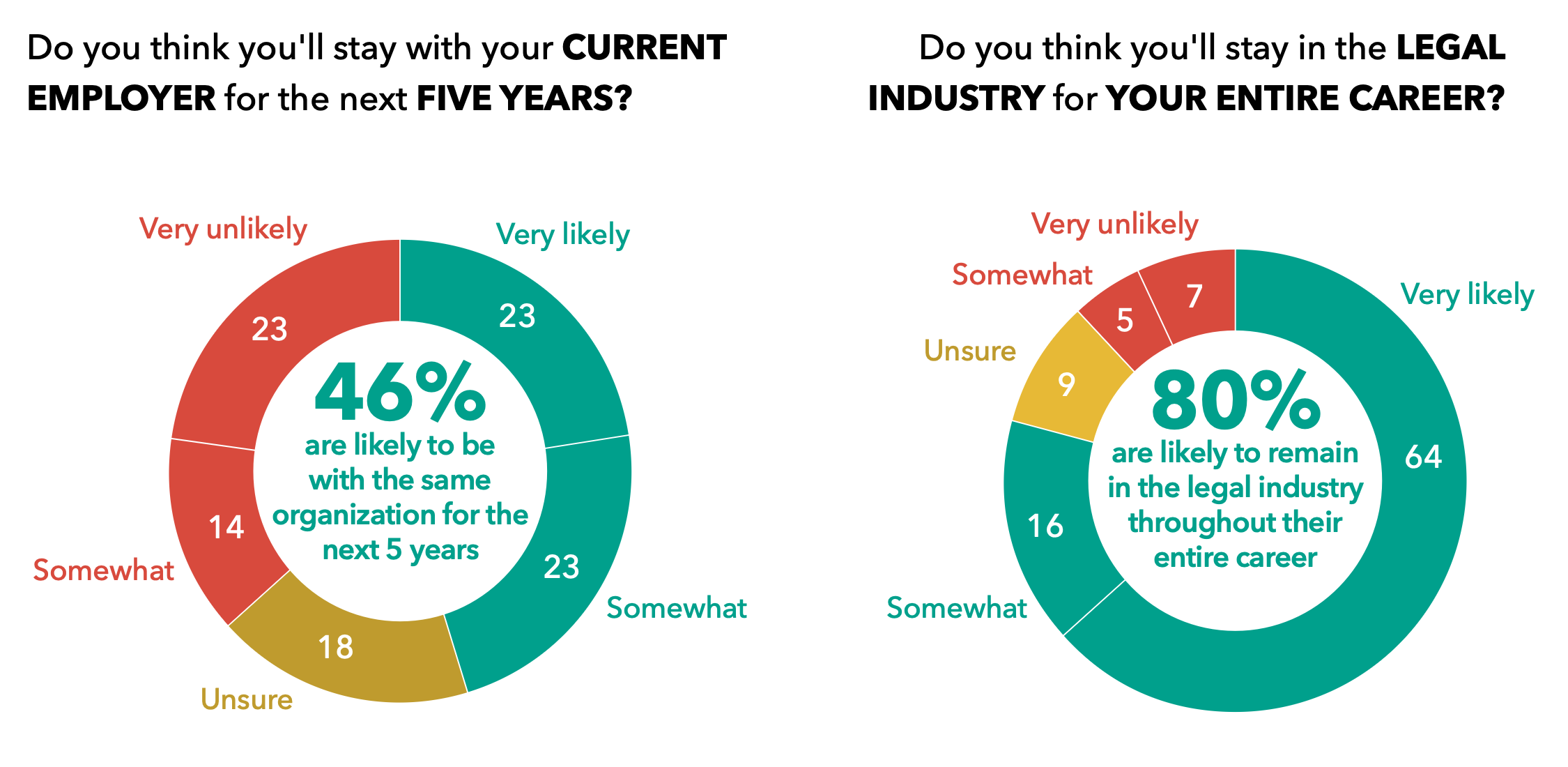 - Only 46% of attorneys expect to remain with their current employer over the next five years.